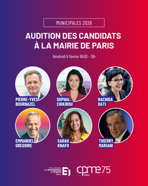 Paris ne vit pas sans son tissu économique. Il est temps que les candidats à la mairie de Paris entendent cette réalité. Le 6 février, le MEDEF Paris et la CPME Paris organisent une grande audition des candidats à la mairie de Paris. Une occasion exceptionnelle pour confronter leurs visions, évaluer leurs propositions et, surtout, placer l’économie réelle au cœur du débat municipal.